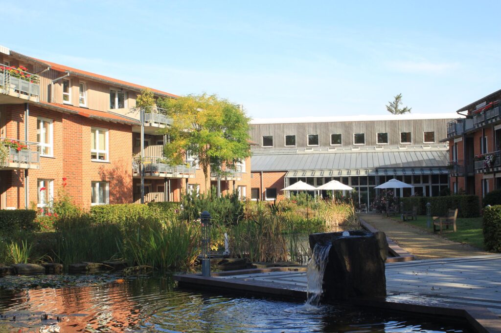 Der WohnPark ist großzügig, funktional durchdacht, barrierefrei und rollstuhlgerecht. Rund die Hälfte der Fläche entfällt auf die Wohnungen, die andere Hälfte auf Gemeinschaftsräume, Sitzecken, weiträumige Flure sowie den Empfangs- und Restaurantbereich. Hier finden Sie Raum für Begegnungen, können sich unterhalten, in Ruhe lesen oder einfach das Treibens im Foyer beobachten. Zentrales Herzstück ist der große Saal gegenüber des Haupteingangs, mit angeschlossener Sonnenterrasse inkl. Strandkörben. Er dient als Restaurant, Treffpunkt zum Kartenspielen oder Unterhalten und kann für private Veranstaltungen in kleinere Räume unterteilt werden. Im weitläufigen Außenbereich wechseln sich Terrassen, Rasenflächen, Sitzgelegenheiten und Wasserflächen ab – ein Ort zum Entspannen, Verweilen und Genießen.